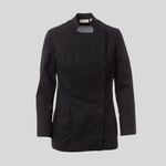 Giacca da chef da donna con collo alla coreana, realizzata in ripstop di cotone e Lycra® T400®, con ottime proprietà elastiche e traspiranti, e con confortevole tessuto a rete su schiena e sottomanica, per amplificare la traspirazione. Chiusura a doppio petto con bottoni automatici, lembo ripiegabile e fissabile al petto mediante allaccio ad un bottone a vista, che crea l’effetto di un bavero sartoriale e di un innovativo scollo a V. Manica lunga con polsino a camicia, chiuso tramite bottone a pressione a vista. Iconica toppa sagomata sulla spalla sinistra, con ricamo ad elica tono su tono, provvista di taschino porta penne. Pratica tasca porta smartphone in vita.