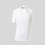 Giacca da cuoca con collo alla coreana, realizzata in twill di cotone e Lycra® T400®, con ottime proprietà elastiche e traspiranti, e con confortevole tessuto a rete su schiena, maniche e vita, per amplificare al massimo la traspirazione. Chiusura a doppio petto con bottoni automatici, lembo ripiegabile e fissabile al petto mediante allaccio ad un bottone a vista, che crea l’effetto di un bavero sartoriale e di un innovativo scollo a V. Manica corta con orlo. Tasca al petto nascosta. 58% cotone 42% elastomultiestere
