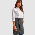 Grembiule mezza lunghezza 65% poliestere / 35% twill di cotone. Grembiule mezza lunghezza. Lacci dello stesso tessuto del grembiule, lunghezza 90 cm. Dimensioni: H 50 cm x L 70 cm. Lavaggio domestico a 60 °C. Lavaggio industriale a 85 °C.