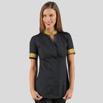 Casacca Hibiscus per parrucchiera, scollatura quadrata, bottoni fissi, 100% poliestere Bohème, tessuto stretch "lava e indossa" che respira, colore Nero/lurex oro, 180gr